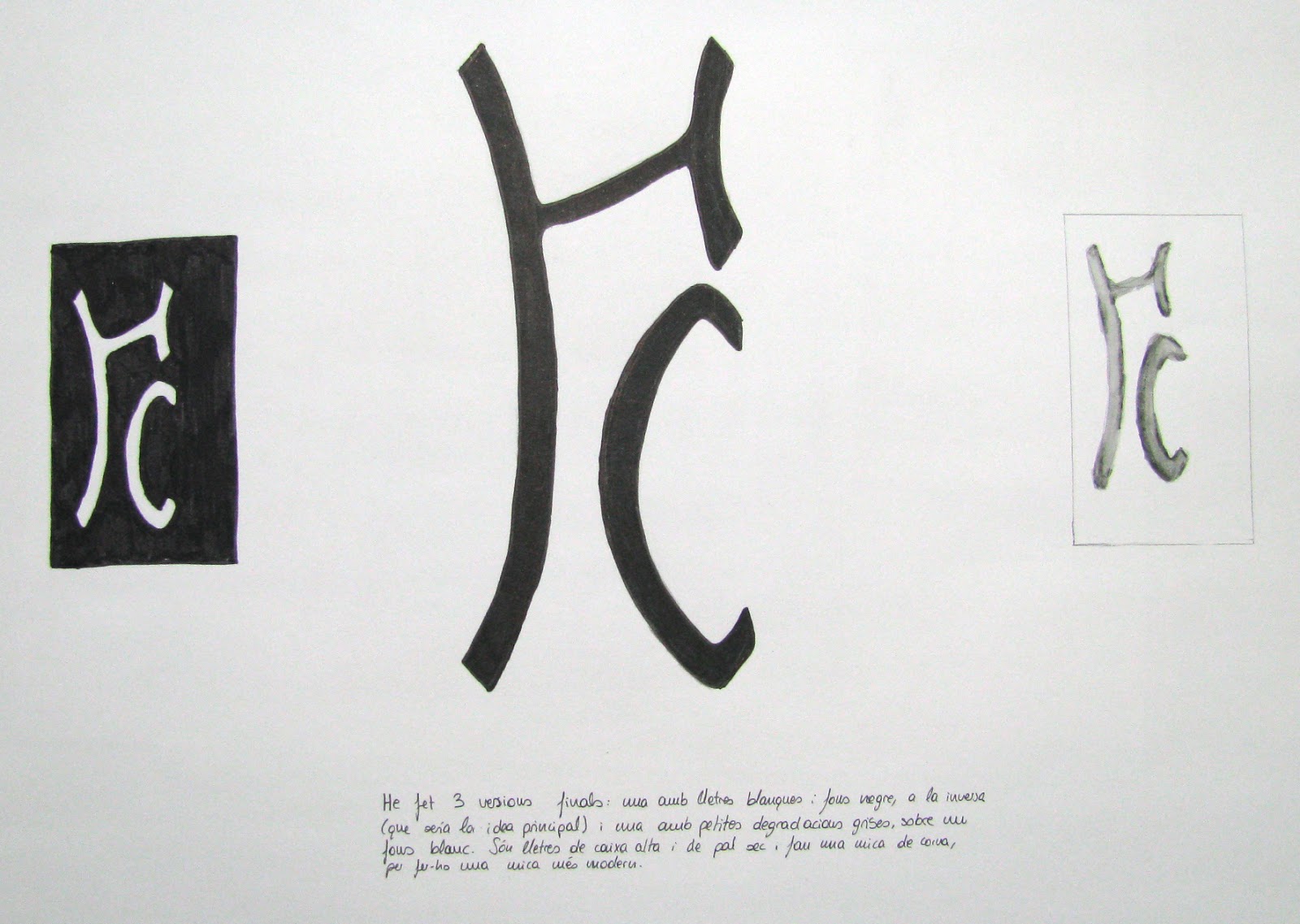 Aquesta és la primera activitat de selectivitat que l'alumnat va haver de resoldre en dues hores. Consisteix en crear un monograma gràfic a partir de la fusió o unió de dues lletres lletres majúscules, la H i la C, per tal de convertir-lo en imatge corporativa d'una empresa. L'estètica i els valors sígnics que l'alumnat li podia afegir a aquest disseny era de caràcter lliure, i va ser una oportunitat per a prendre decisions sobre aspectes de tipografia, la família, el cos, la font, l'estil, la composició, el color... aspectes del disseny gràfic. L'exercici també va ser el primer contacte de l'alumnat amb les proves de selectivitat de disseny i amb una manera de treballar i d'enfocar les làmines, amb uns processos creatius diferents dels de dibuix. Tots els treballs estan realitzats en làmina din a 3, i es van poder millorar a casa un cop corregits. Tot seguit us passo als guns exemples: